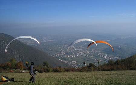Nella zona tra Romano d'Ezzelino, Borso e Crespano, in provincia di Treviso, la pratica di questo sport è particolarmente apprezzata e conosciuta, tanto che la zona del massiccio del Grappa è frequentata da scuole di tutta Europa. Proprio a Borso del Grappa ogni anno si svolge la gara internazionale di deltaplano e parapendio con i migliori piloti del mondo. Fantastico è anche il panorama che si gode sopra le Prealpi vicentine, Asiago e l'Altopiano dei Sette Comuni, mentre in provincia di Belluno, a Feltre, si può volare sul Monte Avena, con possibilità di partecipare ai corsi di parapendio che vanno da marzo a novembre.