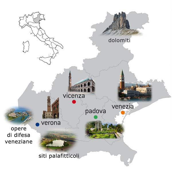 Con quattro siti interamente ricompresi nel proprio territorio e tre che vi ricadono in parte, il Veneto si colloca tra le regioni d'Italia maggiormente rappresentate nella Lista del Patrimonio Mondiale Unesco.