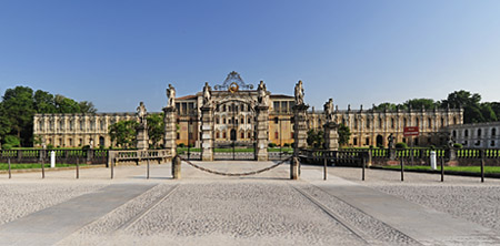 La villa dialoga direttamente con il vasto piazzale antistante, chiuso da un emiciclo porticato, concepito per assolvere a una funzione non solo scenografica, ma anche pratica, come luogo di scambio commerciale per i prodotti della tenuta agricola; sul retro si apre un immenso parco, di circa quaranta ettari, con peschiere, laghi e viali alberati.
