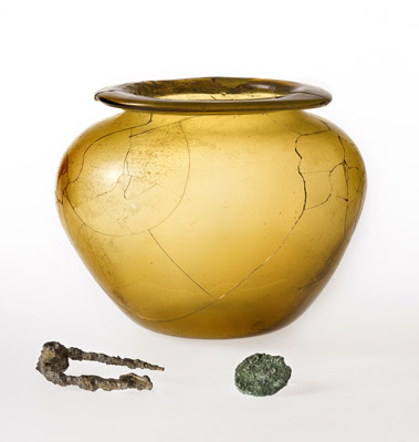 L'olletta in vetro giallo, usata come ossuario probabilmente di un bambino, viste le ridotte dimensioni, conteneva tra i resti cremati gli elementi del corredo: una fibula in ferro e una moneta. Necropoli nord-est dell'Annia, tomba 883, I secolo d.C
