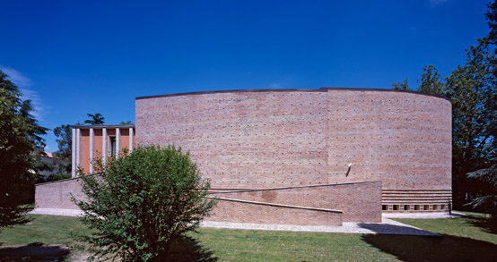 L'architettura scelta da Quirino De Giorgio per il Borgo Rurale di Vigonza è coerente con quella di Candiana: edifici geometrici e mattone lasciato a vista. L'elemento centrale dell'insediamento è il teatro, che ospita quasi seicento posti. (Foto: Matteo Cecchinato)
