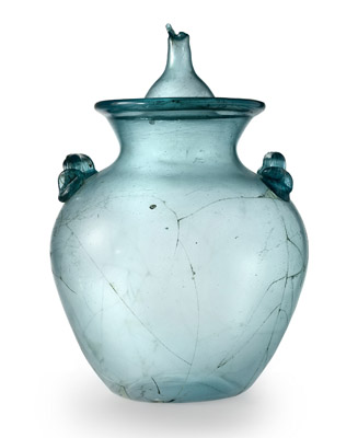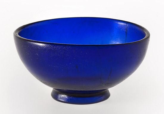 Coppetta in vetro blu traslucido fuso a stampo e molato, ricomposta. Necropoli nord-est dell'Annia, I secolo d. C