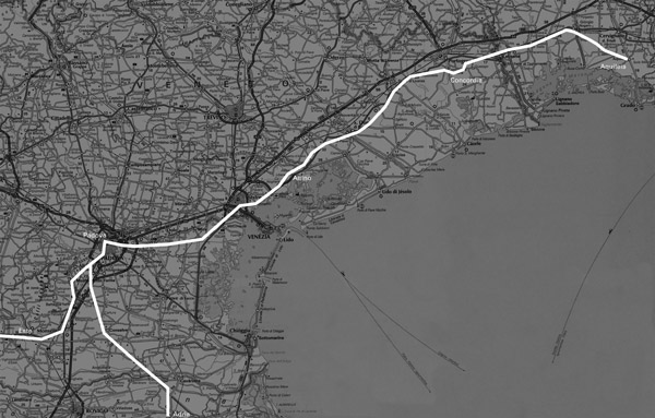La Via Annia e il suo tracciato: ipotesi in direzione Adria e, verso occidente, in direzione Bologna. (elaborazione grafica P. Eberle)