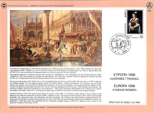 "First day Cover" con il francobollo dedicato a Caterina Corner, nell'ambito delle celebrazioni Europa 1996 Famous Women, emesso il giorno 8 aprile 1996 sotto gli auspici della Cyprus Philatelic Society.